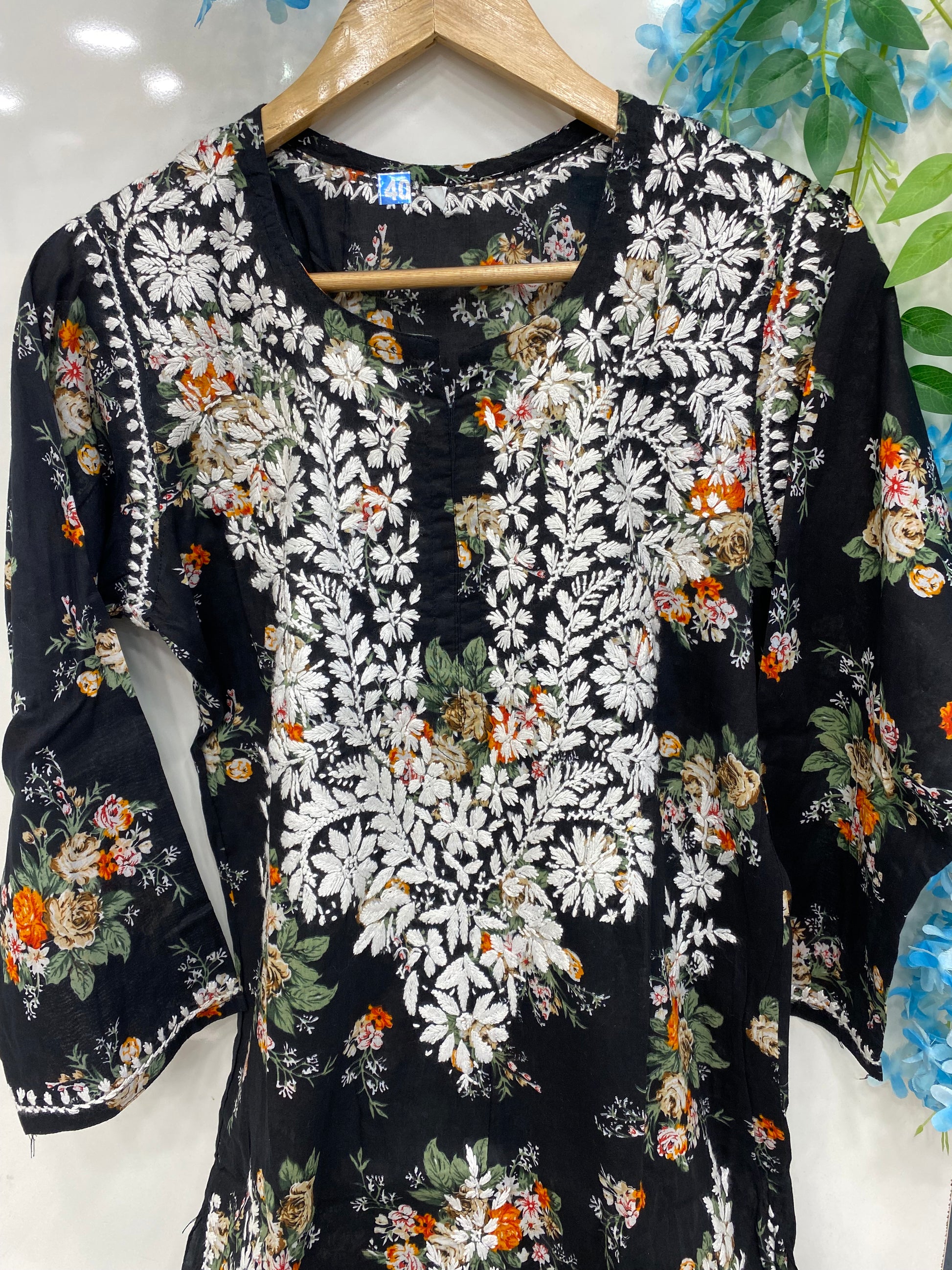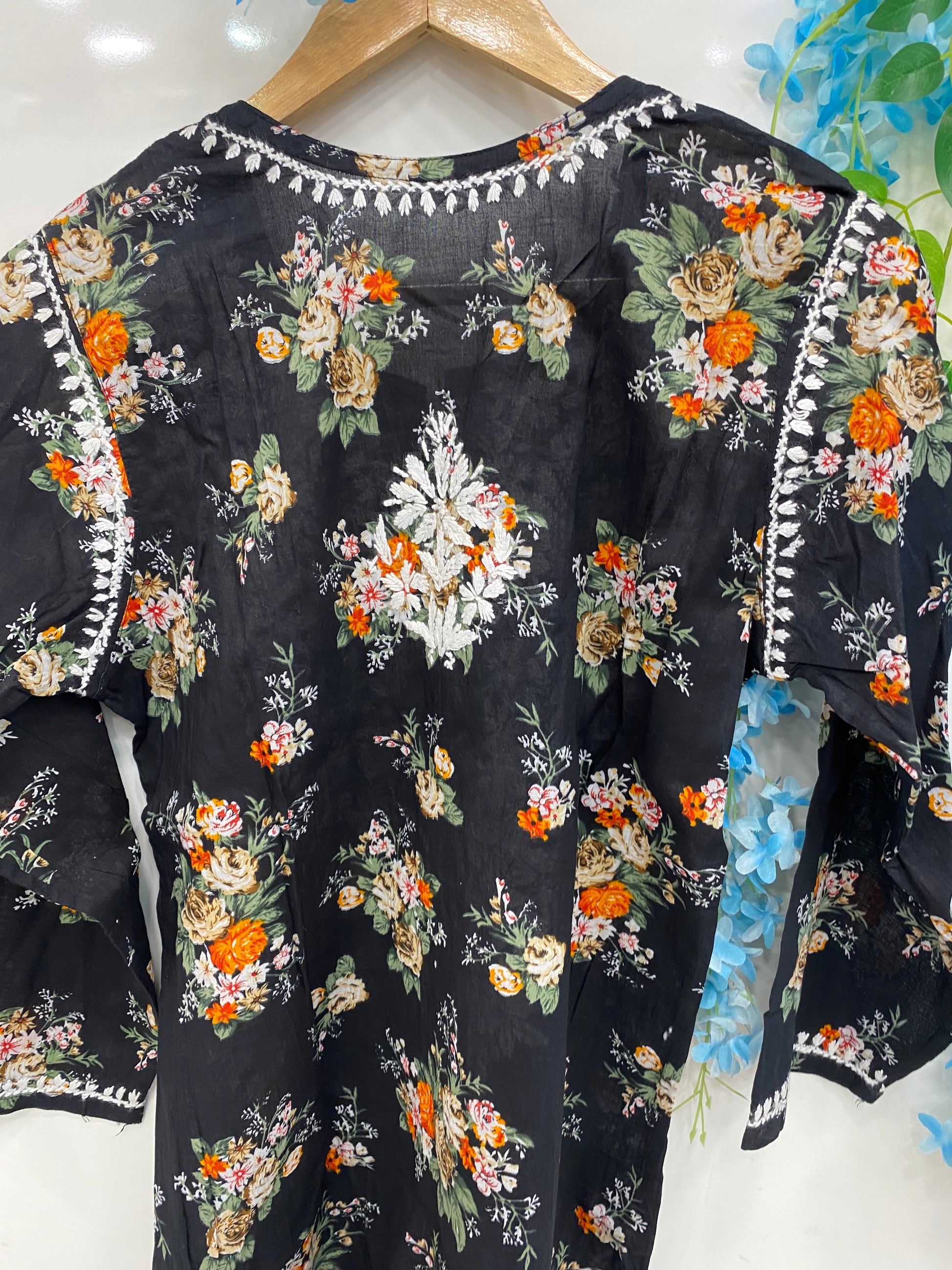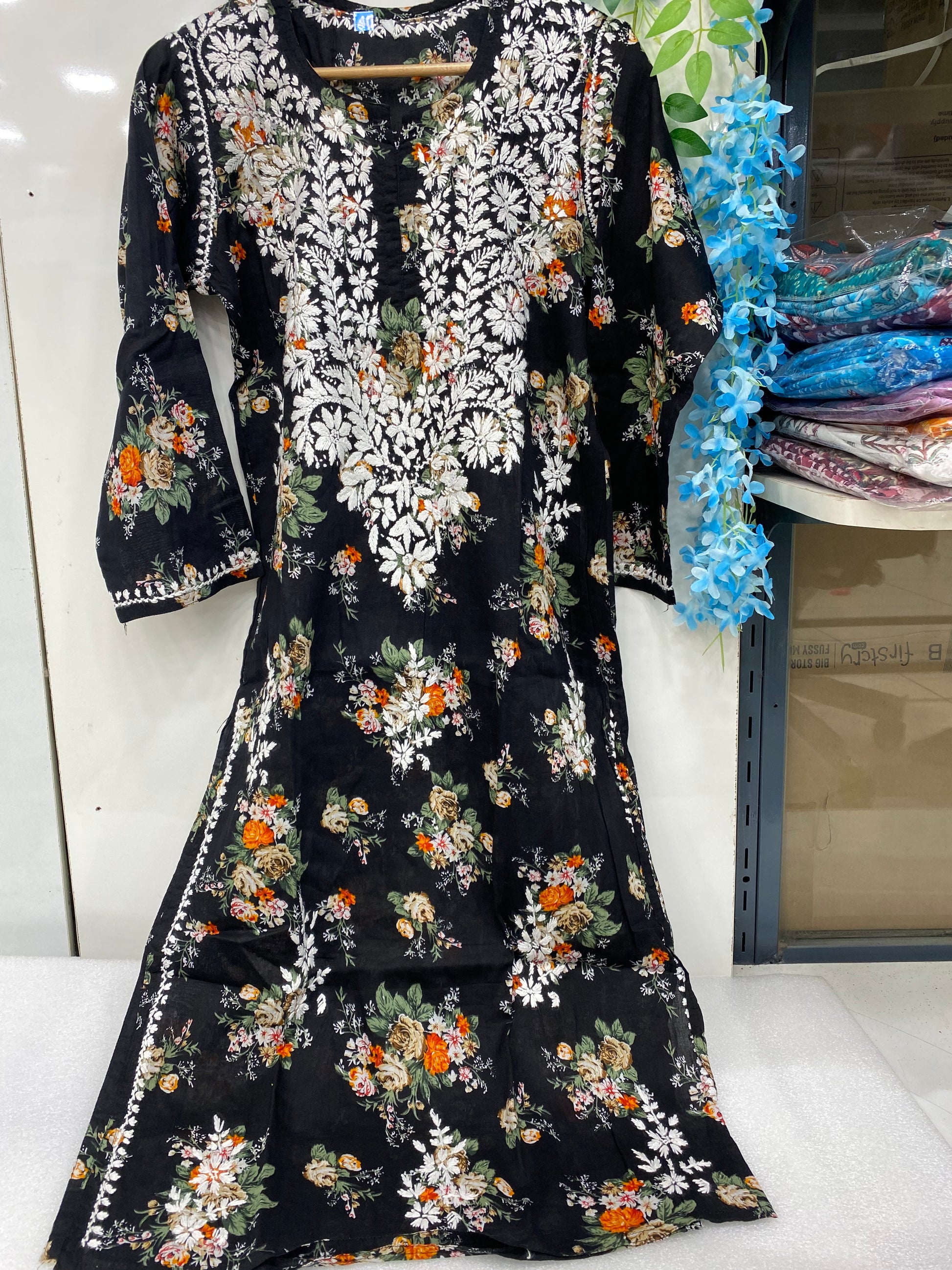 Expertly crafted with delicate chikankari embroidery on soft mulmul fabric, our black floral kurta is a must-have for any wardrobe. Its lightweight and breathable material provides comfort and elegance, making it perfect for any occasion. Own a timeless piece of traditional Indian fashion with our chikankari mulmul kurta.