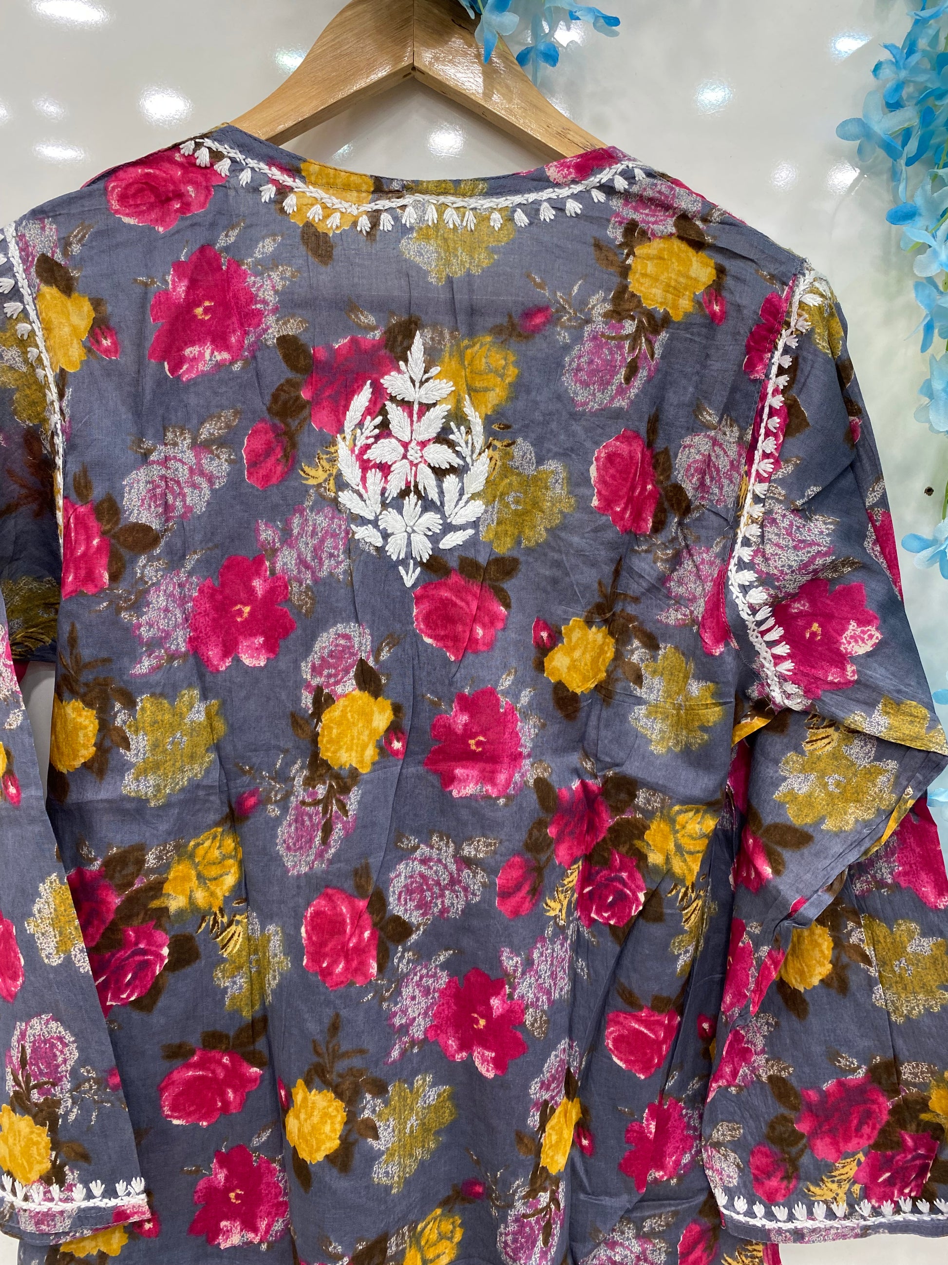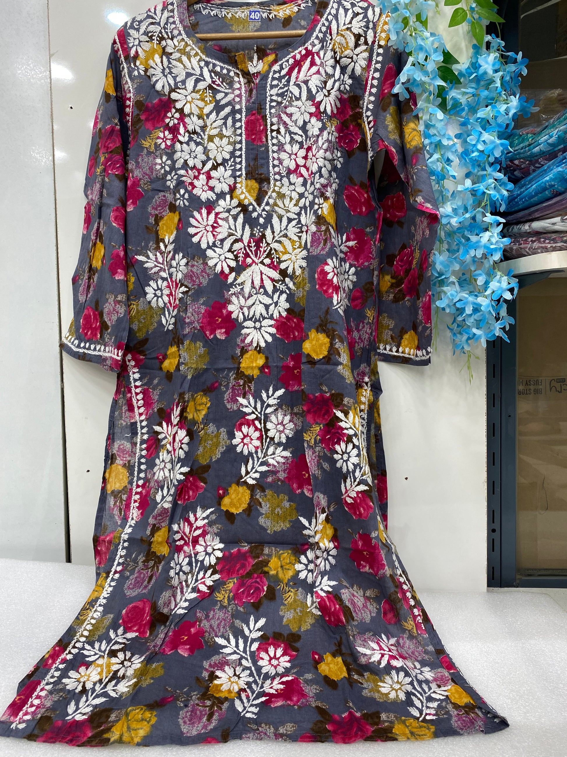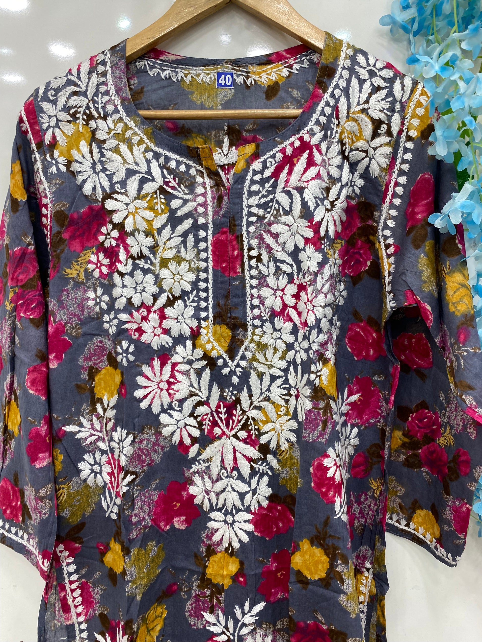 Upgrade your work wardrobe with our Grey Floral Hand Embroidery Chikankari Kurti. Expertly crafted with delicate grey floral chikankari detailing, this kurti exudes sophistication. Perfect for the office, its elegant design adds a touch of professionalism to your look. Elevate your style with this timeless piece.