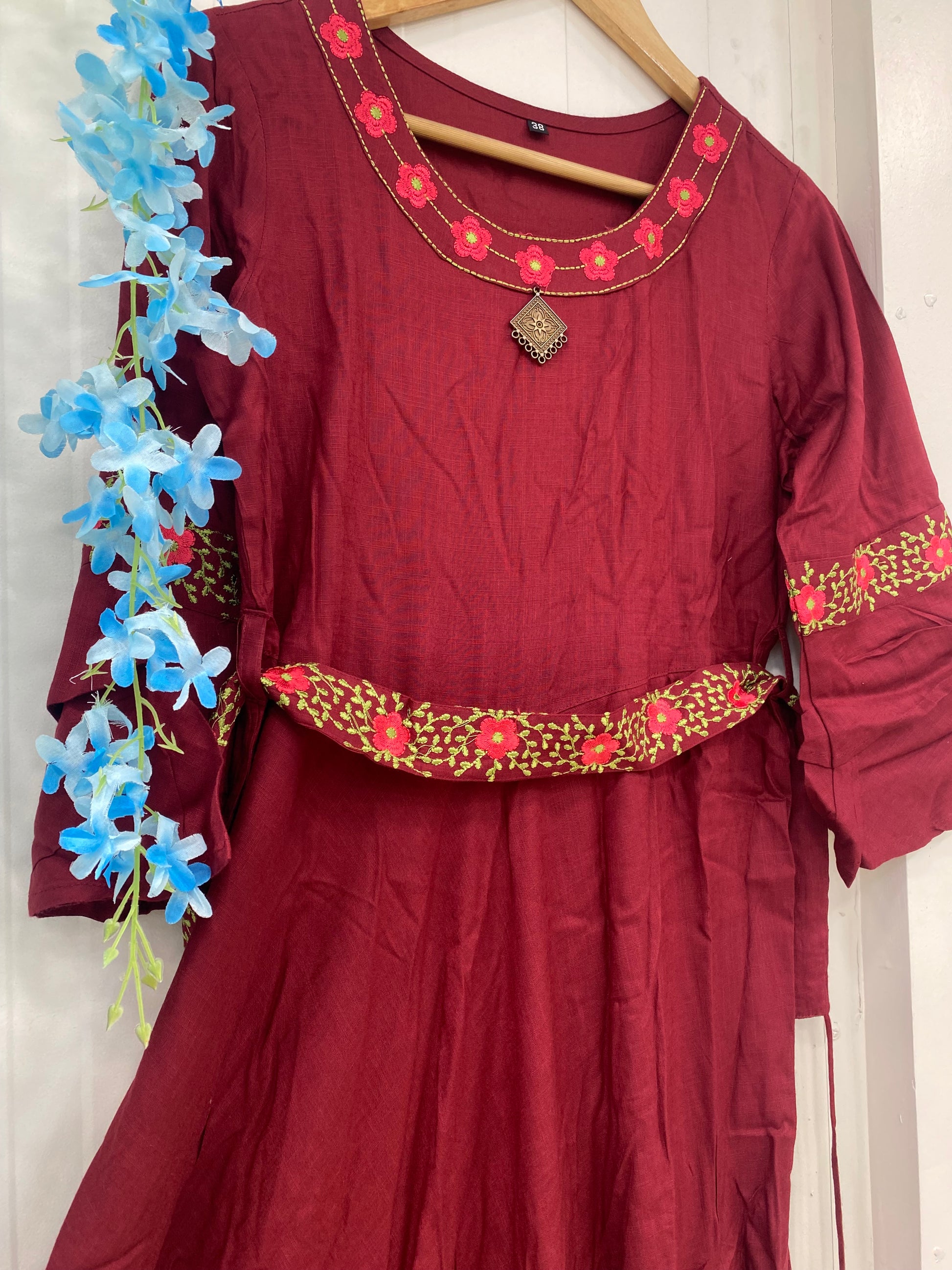 Discover the beauty and elegance of our Maroon Long Frock Style Kurti. The frock style and bell sleeves give a trendy and modern touch, while the embroided belt on the waist adds a flattering shape. Made from heavy rayon fabric, this kurti is both comfortable and durable. The intricate work on the neck and sleeves adds a touch of sophistication to your wardrobe.