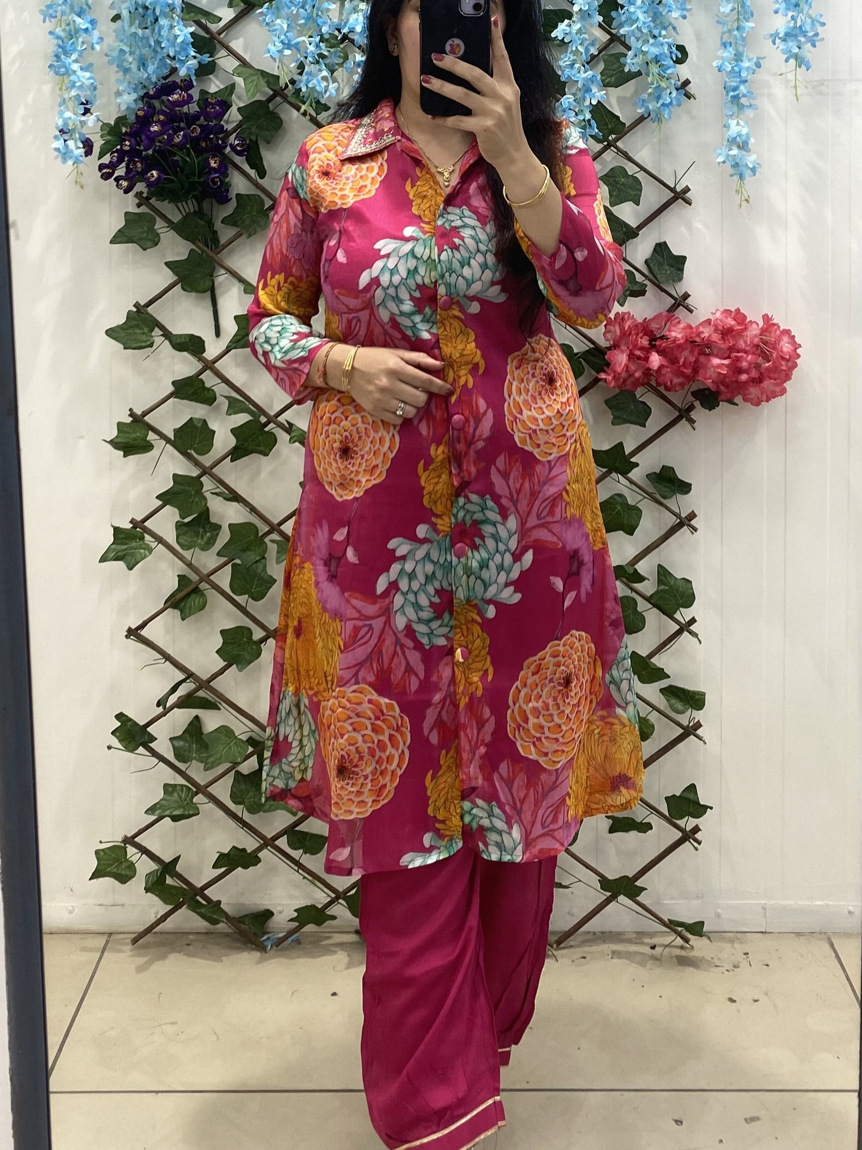Made with luxurious chinon fabric, this Pink Chinon Co-ordset is perfect for any party. Featuring a sophisticated collar and a coordinated set, this outfit will elevate your style and make you stand out from the crowd. Add a touch of elegance to your wardrobe with this stunning co-ordset.