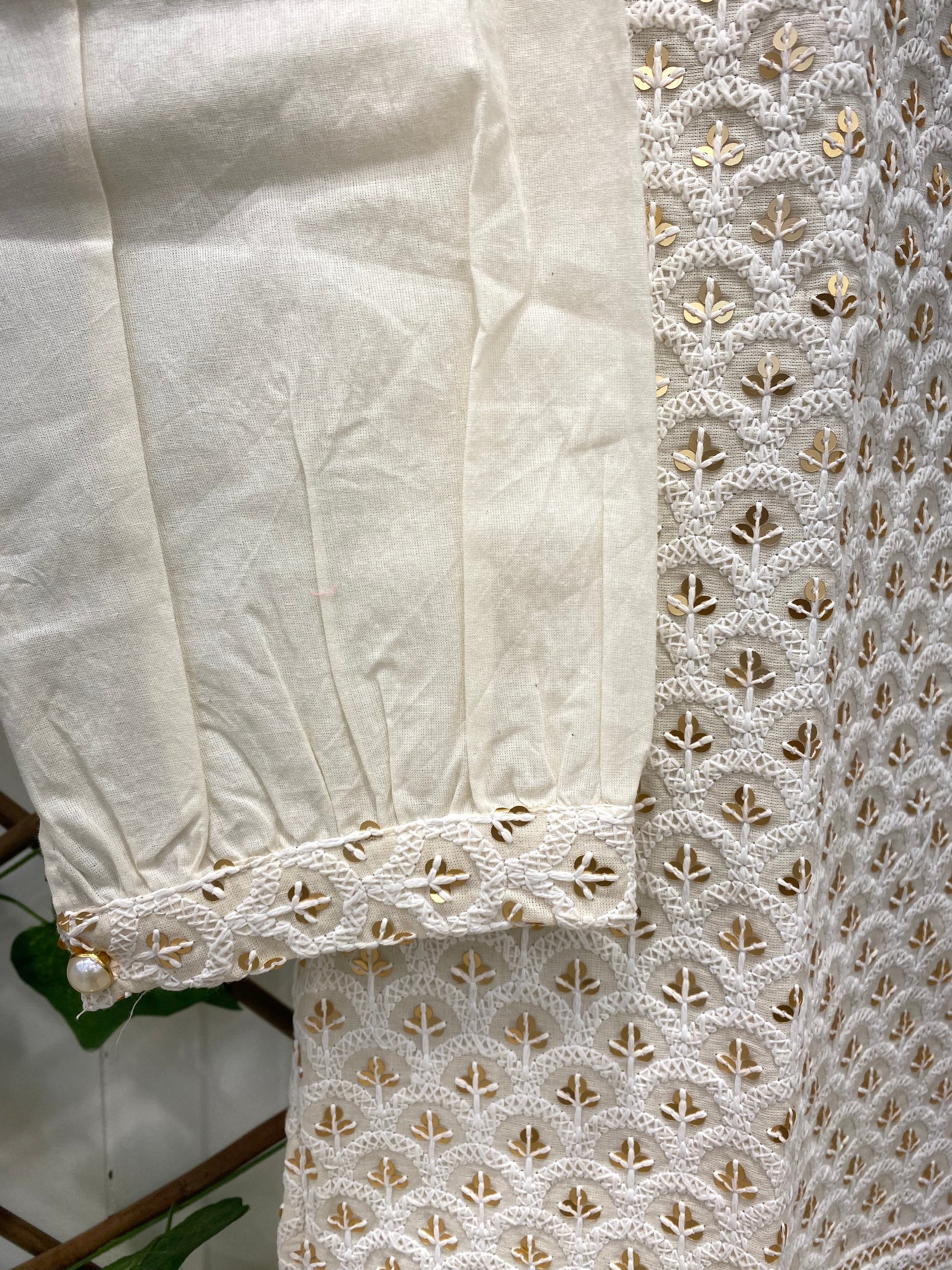 Embody effortless elegance with our Schiffli co-ord set, featuring intricate golden bead work detailing on entire shirt and even on both the sleeves and pants. Perfect for any occasion, from casual outings to formal events, this set will elevate your style and turn heads wherever you go. Experience the luxury of comfortable yet stylish fashion today!