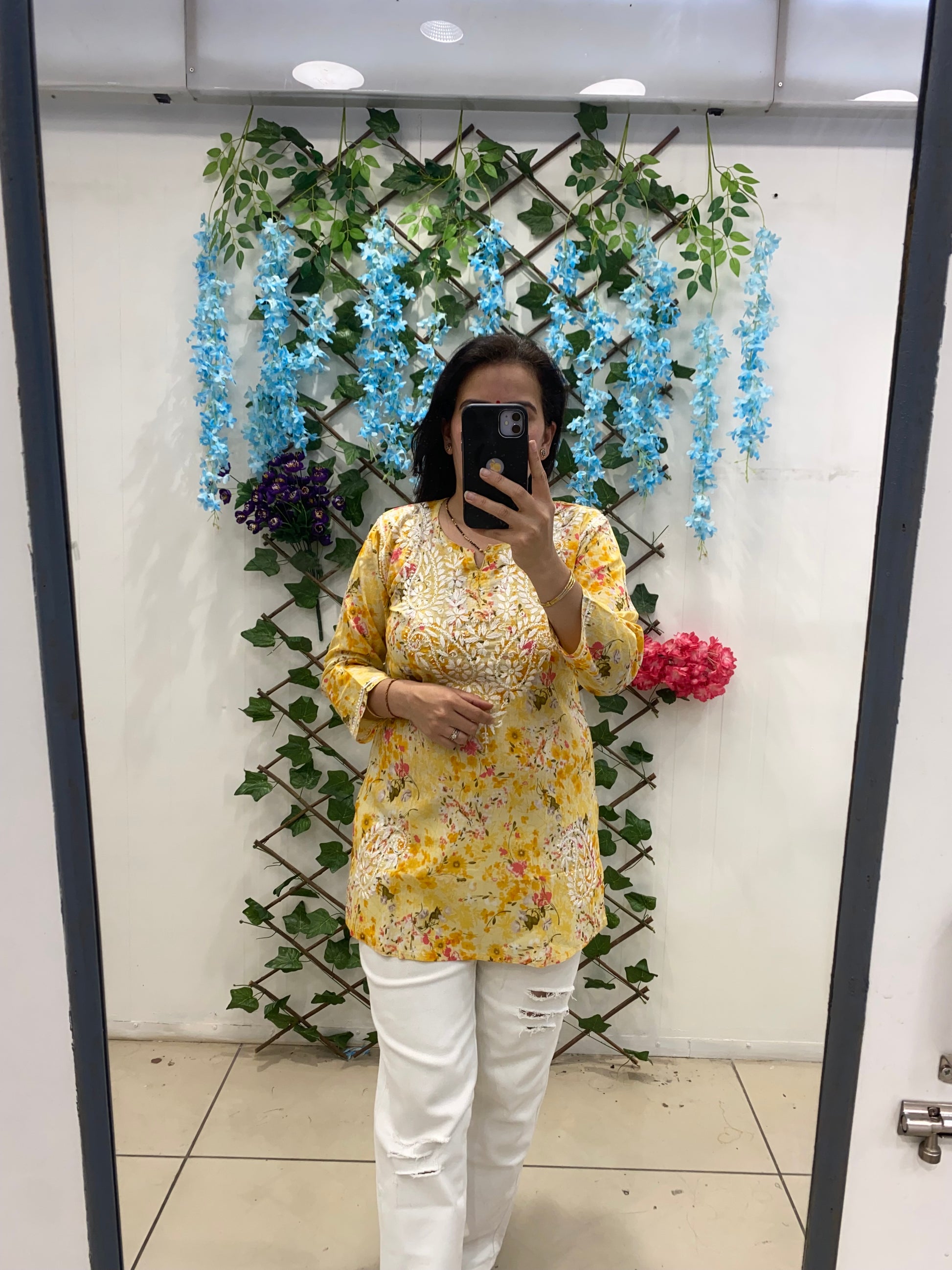 Expertly crafted in soft cotton and adorned with intricate chikankari embroidery, our Yellow Cotton Chikankari Kurti is a versatile addition to your wardrobe. Easily dressed up or down, pair it with white pants for a classic look or flared jeans for a modern twist. Elevate your style game with this must-have piece.