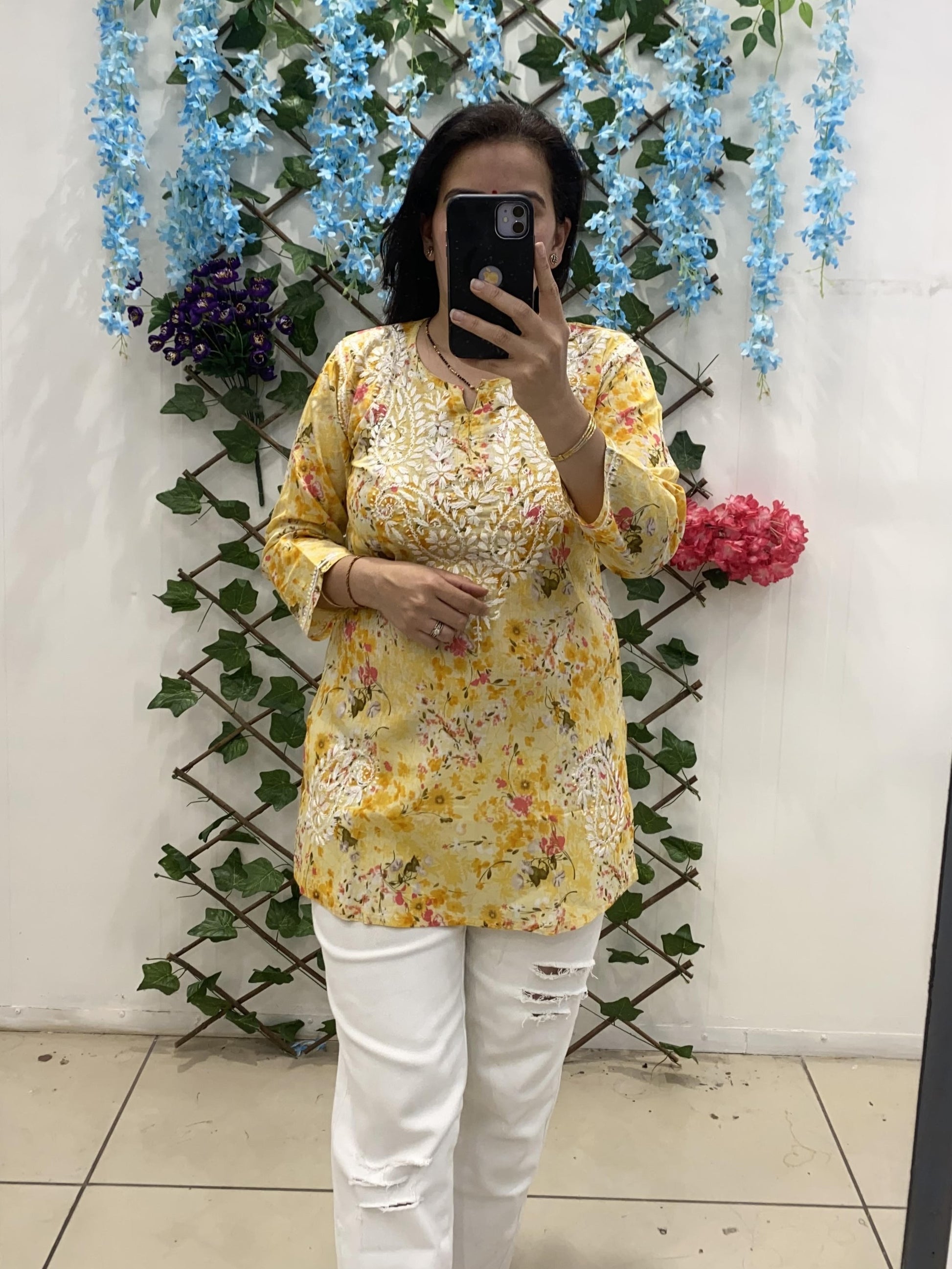 Expertly crafted from soft and breathable mul cotton, this chic yellow short kurti features delicate chikankari work. Its straight fit makes it perfect for any occasion, from the office to college, or a casual day out. Pair it with rugged white jeans and jootis for a stylish and comfortable look.